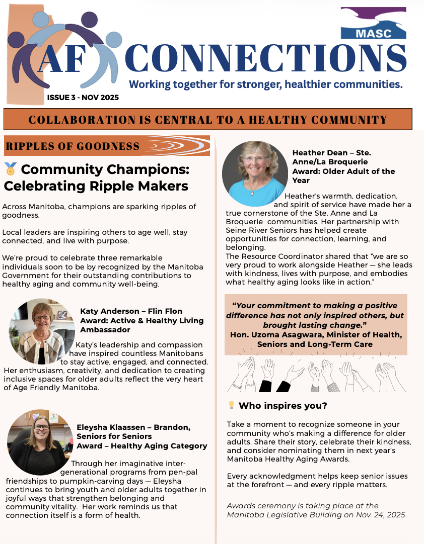 MASC has an Age-Friendly Resource Team that can visit communities (in person or virtual) across the Province and support local interests in becoming more age-friendly.